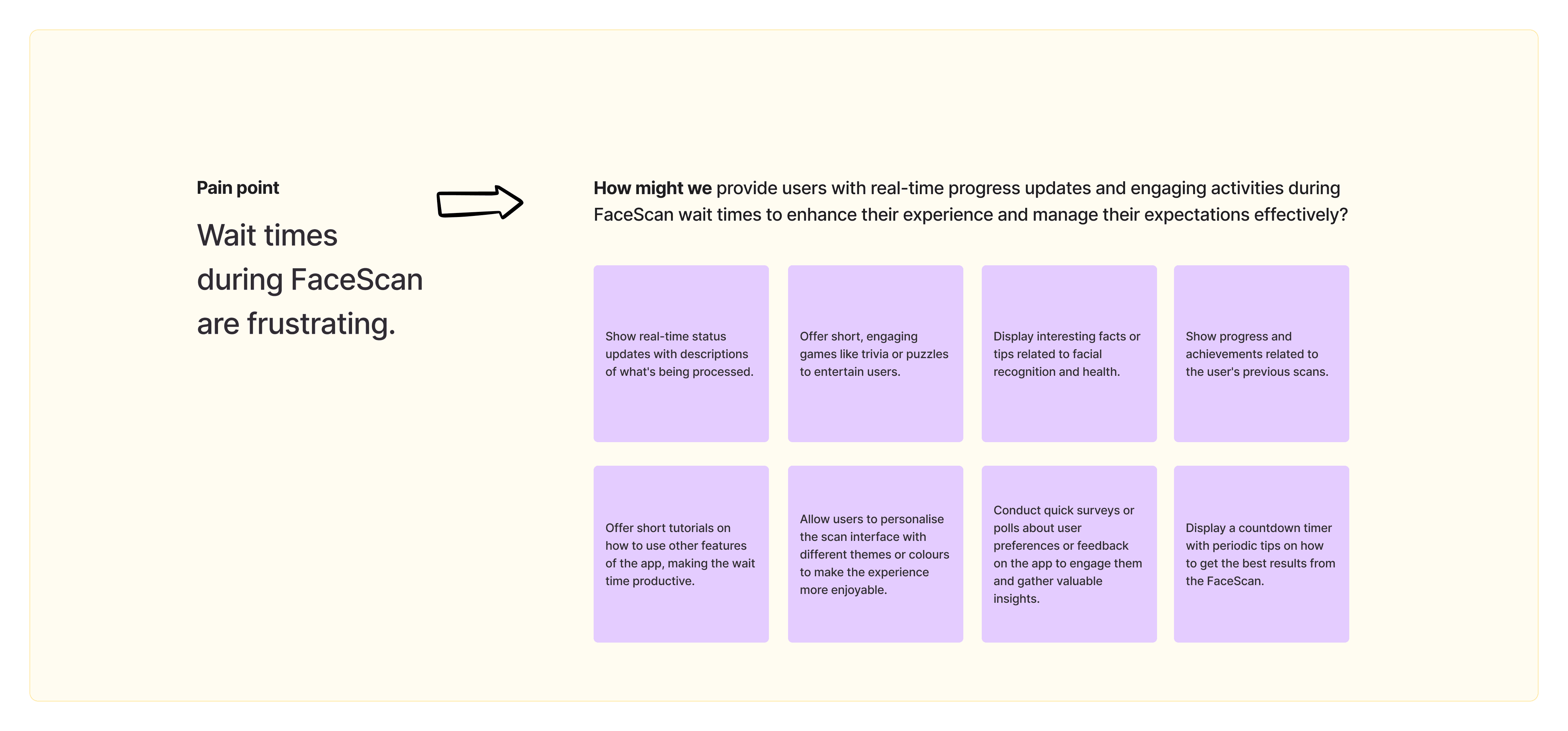 I facilitated an ideation workshop to brainstorm how we might solve the identified pain points. We transformed each pain point into a "How Might We" question – for example, “How might we provide feedback during scans to reduce user anxiety?” This approach sparked creative solutions focused on user needs.