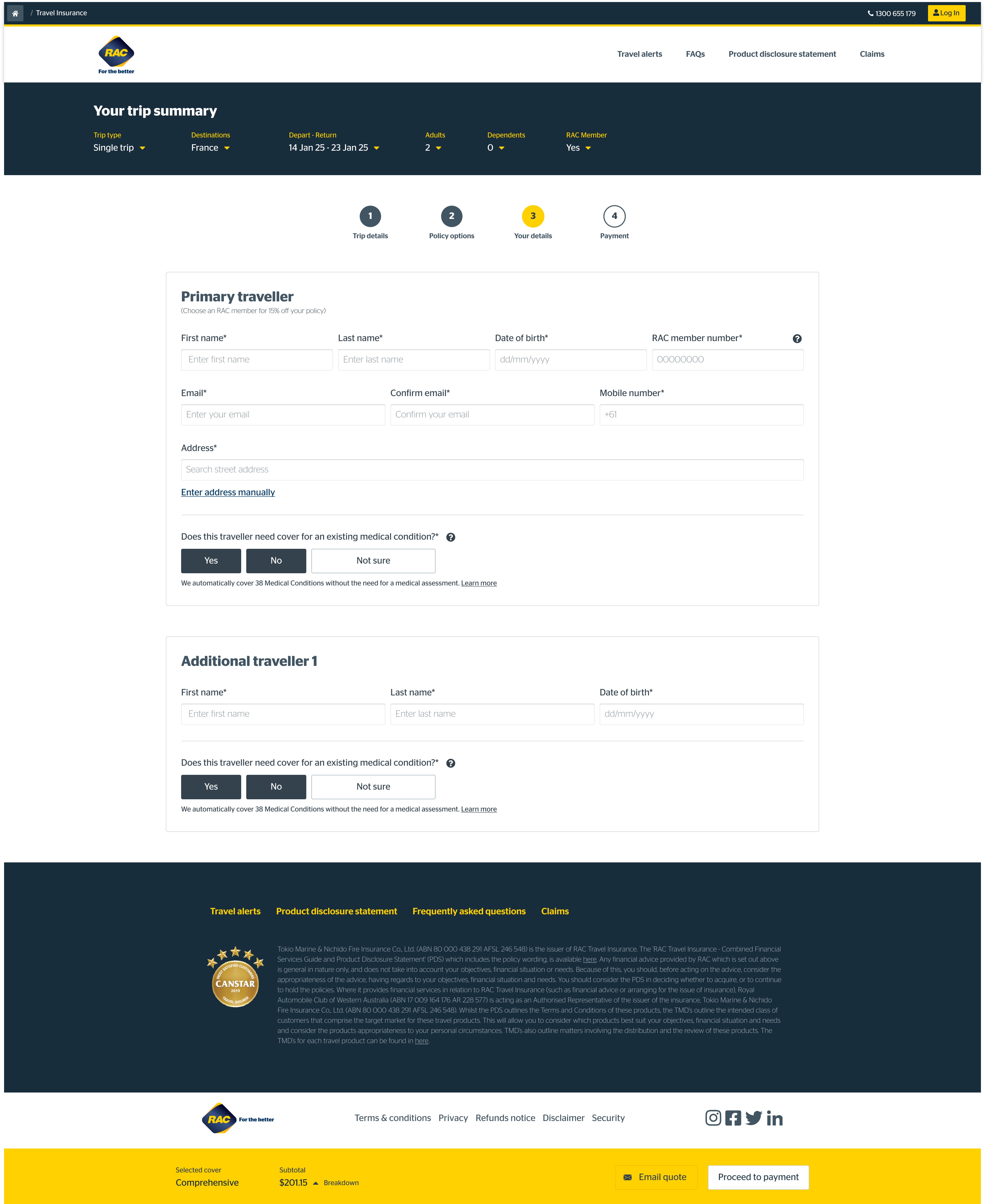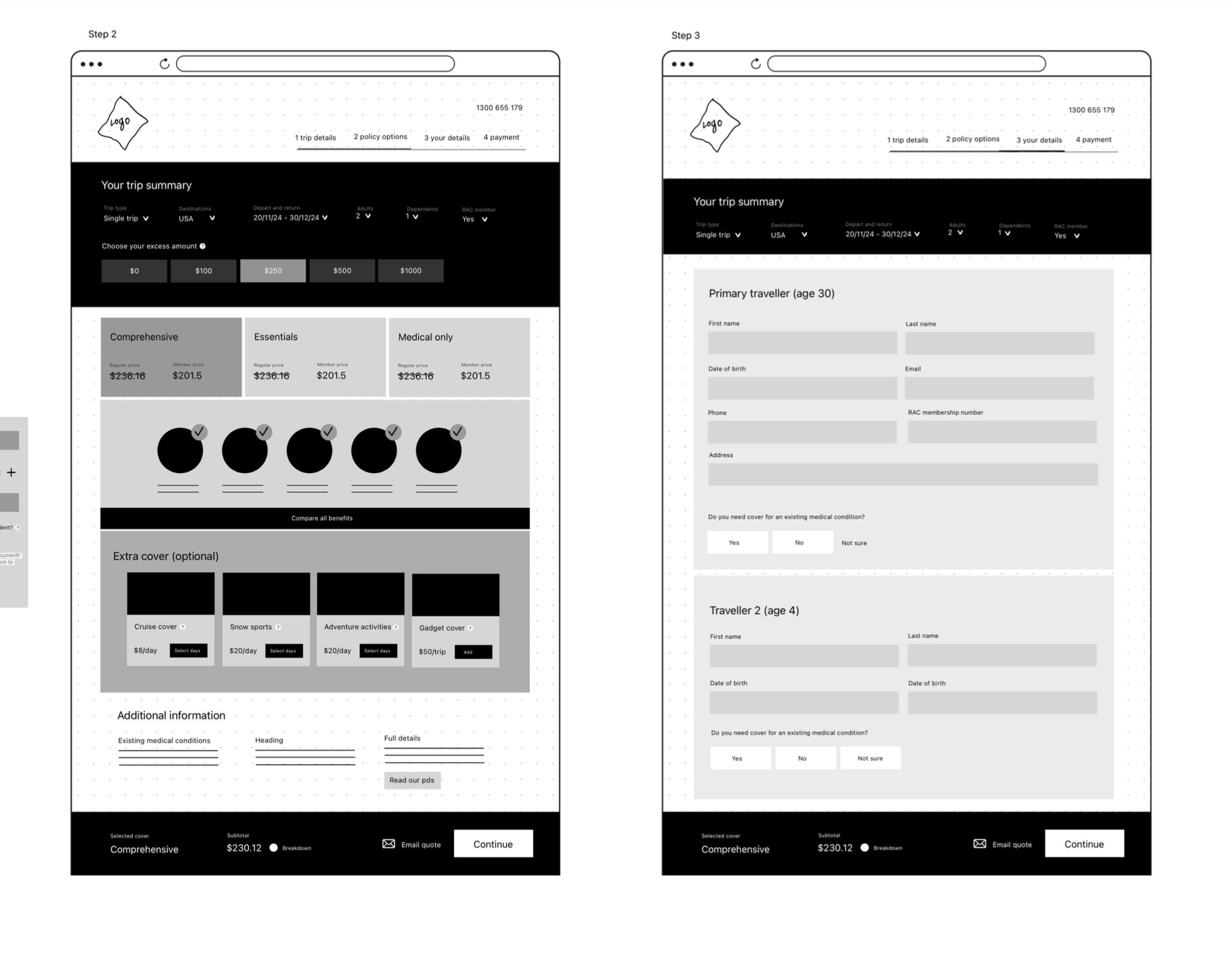 I led the design of the travel insurance purchasing experience over a 4-month period. My primary focus was redesigning the quoting and purchasing journey to drive conversion and clarity.