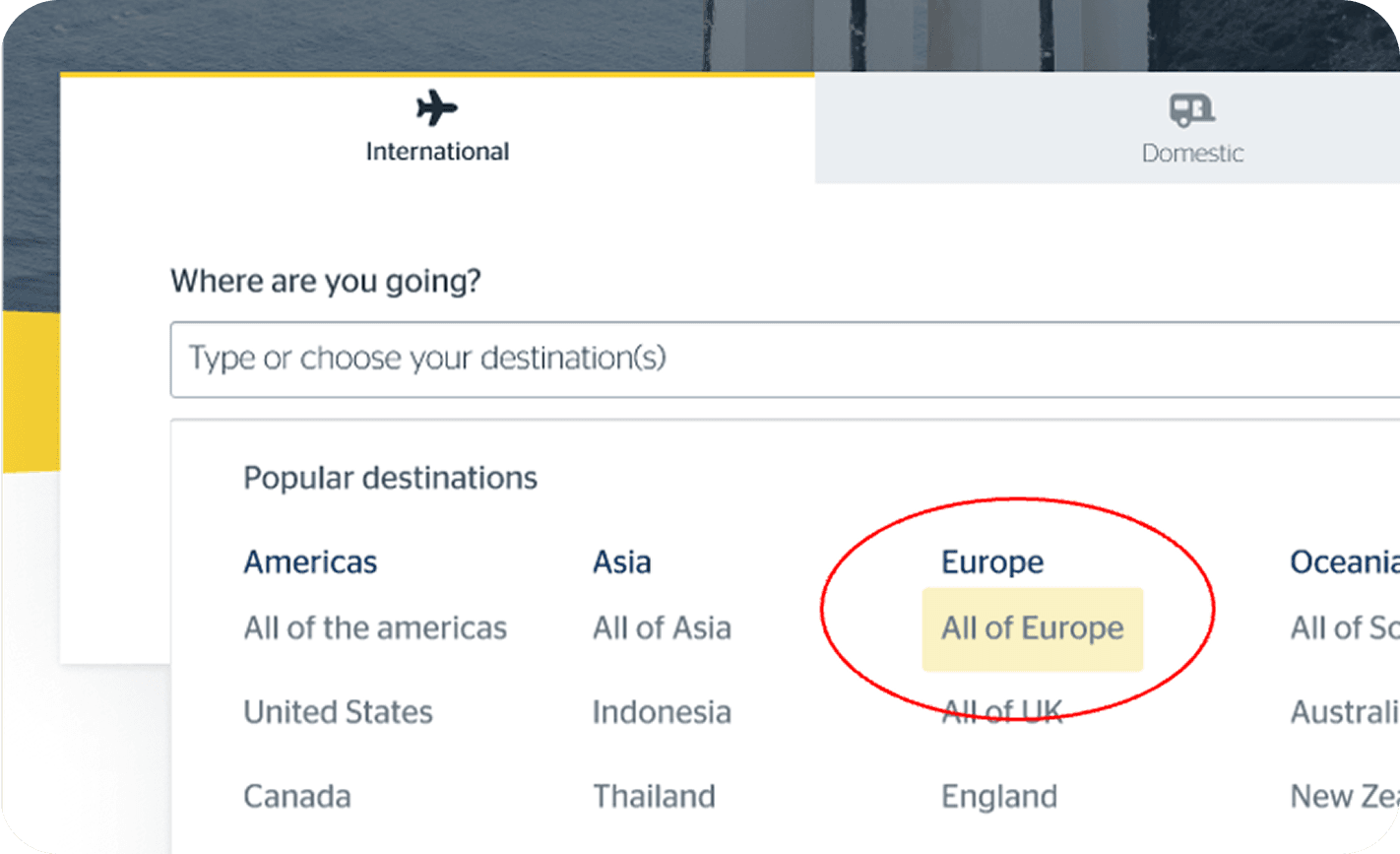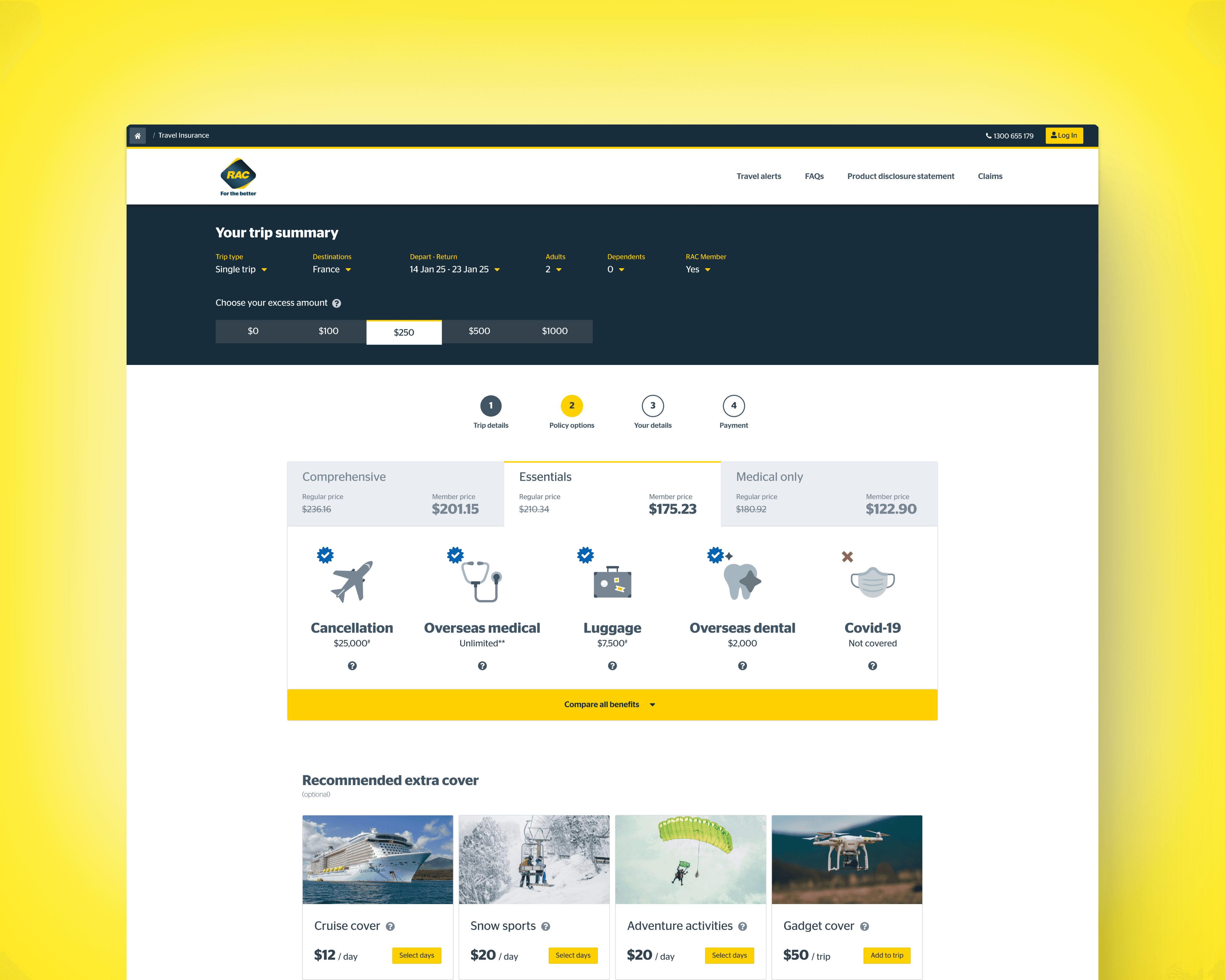 A cleaner, more intuitive policy selection process paired with duration-based add-ons personalised to the user's destination and demographic.