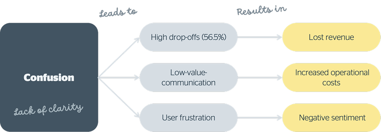I visualised how each friction point—like complex jargon or rigid forms—compounded the user's stress, directly correlating with drop-off rates.